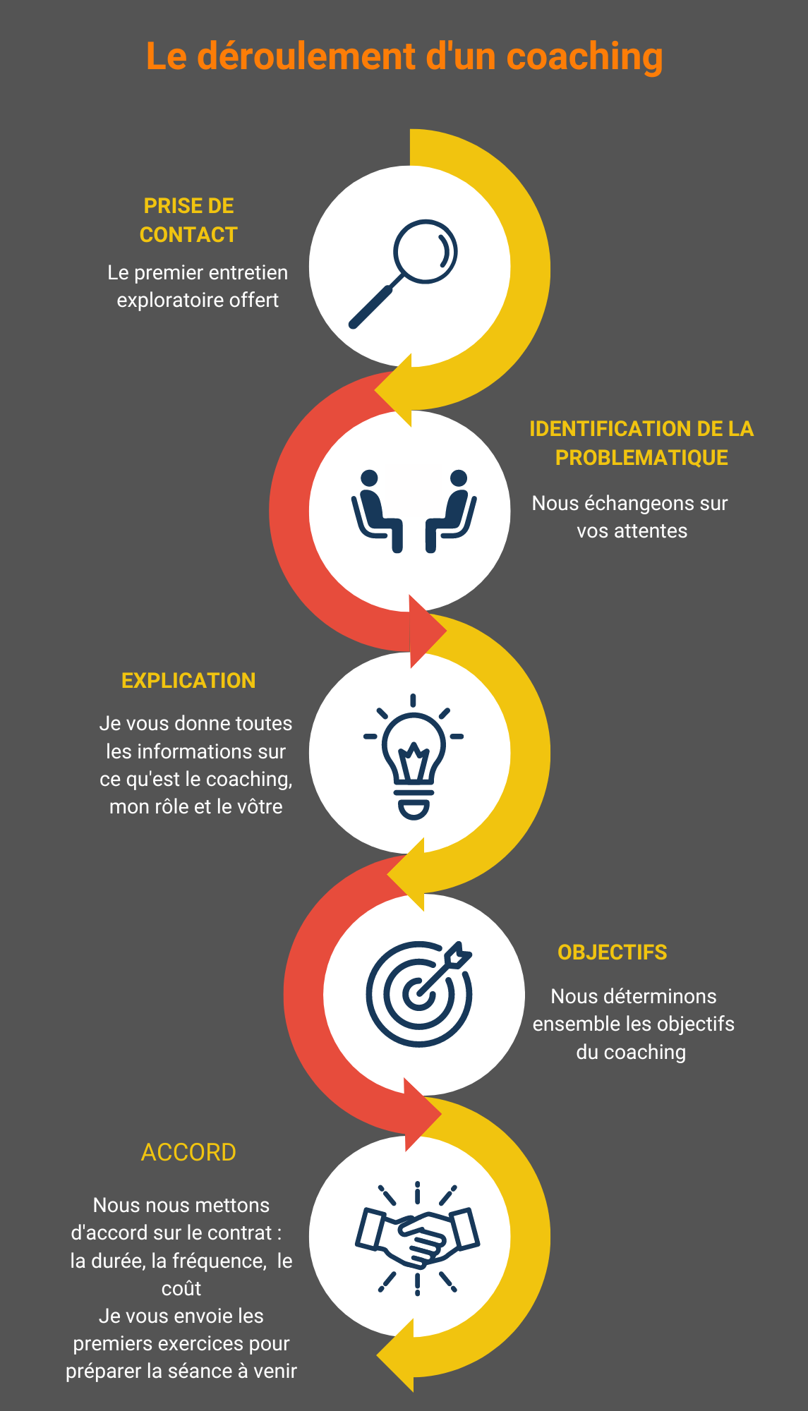 Il est toujours mené dans une posture éthique de confidentialité, d’ouverture, sans jugement et avec patience. Ma posture est "bien-veillante" et respectueuse. J'encourage pour conduire la personne coachée vers l'autonomie et la confiance.